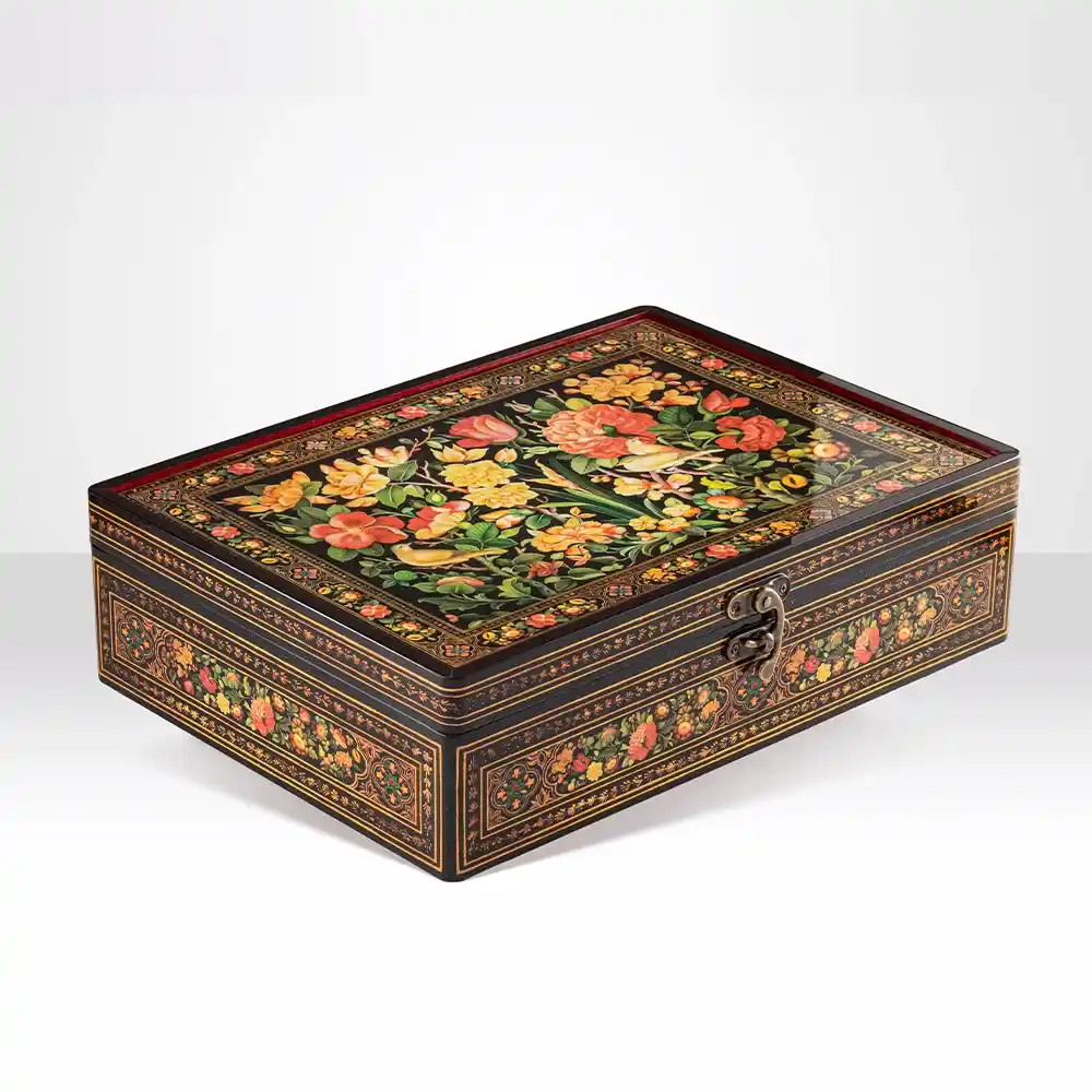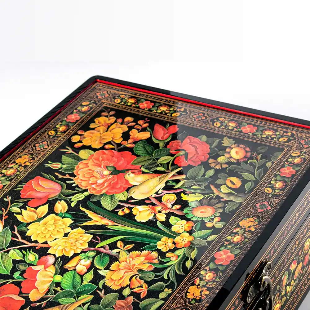 - طرحهای گل و مرغ، که از نقوش سنتی ایرانی الهام گرفتهاند، با دقت و ظرافت بر روی جعبهها اجرا میشوند. این نقوش نمادین، نمایانگر طبیعت، زیبایی و آرامش هستند و به هر جعبه جلوهای منحصر به فرد میبخشند.